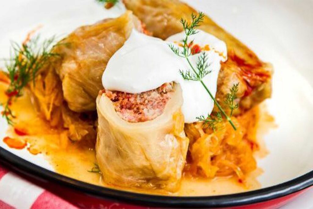 - A töltelékeket óvatosan kiszedjük, és berántjuk a káposztát. Ehhez az olajat felforrósítjuk, megpirítjuk benne a lisztet. Felöntjük 2 dl hideg vízzel, csomómentesre elkeverjük, a káposztához adjuk, és 10 percig forraljuk. A töltelékeket a tetejére tesszük, és tejföllel kínáljuk.